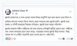 মঙ্গলবার (২৯ জুলাই) দুপুরে নিজের ভেরিফায়েড ফেসবুক অ্যাকাউন্টে দেওয়া এক স্ট্যাটাসে তিনি এই মন্তব্য করেন।
