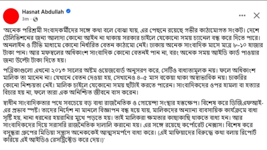 পোস্টে হাসনাত আবদুল্লাহ বলেন—‘অনেক পরিশ্রমী সংবাদকর্মীদের সঙ্গে কথা বলে বোঝা যায়, এর পেছনে রয়েছে গভীর কাঠামোগত সংকট। দেশে টেলিভিশনের জন্য আলাদা কোনো আইন না থাকায় সরকার চাইলে যেকোনো সময় চ্যানেল বন্ধ করে দিতে পারে। অনলাইন ও টিভি মাধ্যমে কোনো নির্ধারিত বেতন কাঠামো নেই। ঢাকায় অনেক সাংবাদিক মাসে মাত্র ৮–১০ হাজার টাকা পান। আর মফস্বলের অধিকাংশ সাংবাদিক কোনো বেতনই পান না, বরং অনেক সময় আইডি কার্ড পাওয়ার জন্য উলটো টাকা দিতে হয়।
