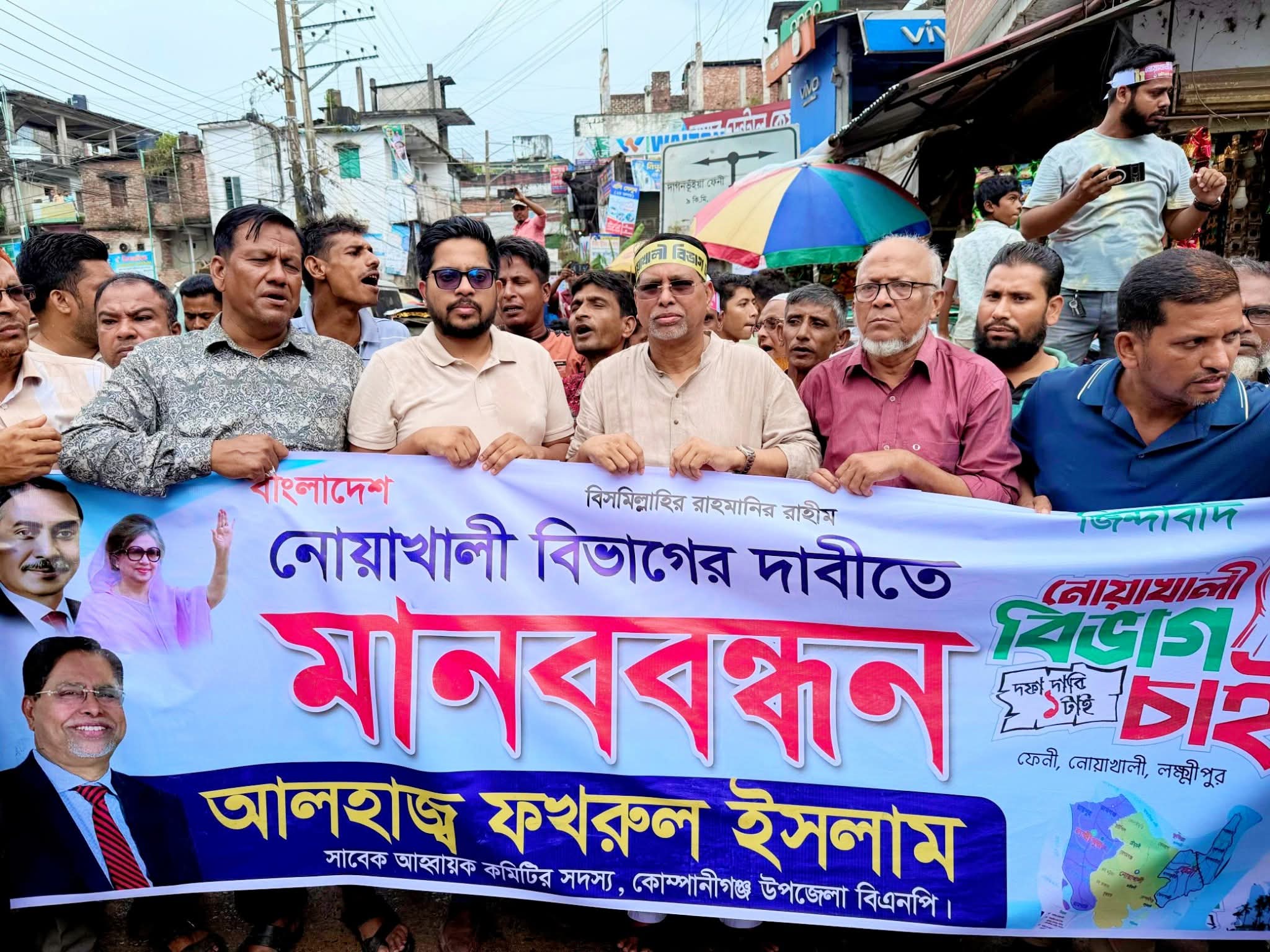 নোয়াখালীকে স্বতন্ত্র বিভাগ ঘোষণার দাবিতে দিন দিন সরব হয়ে উঠছেন জেলার সর্বস্তরের মানুষ। জেলার বিভিন্ন উপজেলায় চলমান বিক্ষোভ ও সমাবেশের ধারাবাহিকতায় শনিবার,,,, সকালে কোম্পানীগঞ্জ উপজেলা পরিষদের সামনে সাংবাদিক,শিক্ষক সমাজ, এবং সামাজিক সংগঠনগুলোর উদ্যোগে এক মানববন্ধন ও বিক্ষোভ মিছিল অনুষ্ঠিত হয়।