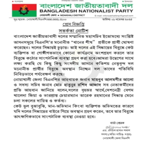 নোয়াখালী জেলা বিএনপি তাদের অঙ্গ ও সহযোগী সংগঠনের সকল নেতাকর্মীদের উদ্দেশ্যে এক বিশেষ সতর্কতা নোটিশ জারি করেছে।