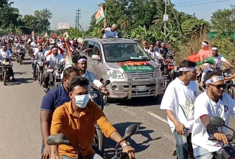 মোটর শোভাযাত্রায় দলীয় নেতাকর্মীরা জাতীয় ও দলীয় পতাকা, ফেস্টুন ও প্ল্যাকার্ড নিয়ে অংশ নেন, যা পুরো এলাকায় উৎসবমুখর পরিবেশ সৃষ্টি করে।