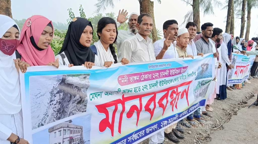 ভাঙন রোধে কার্যকর ব্যবস্থার দাবিতে নোয়াখালীতে মেঘনার পাড়ে মানববন্ধন
